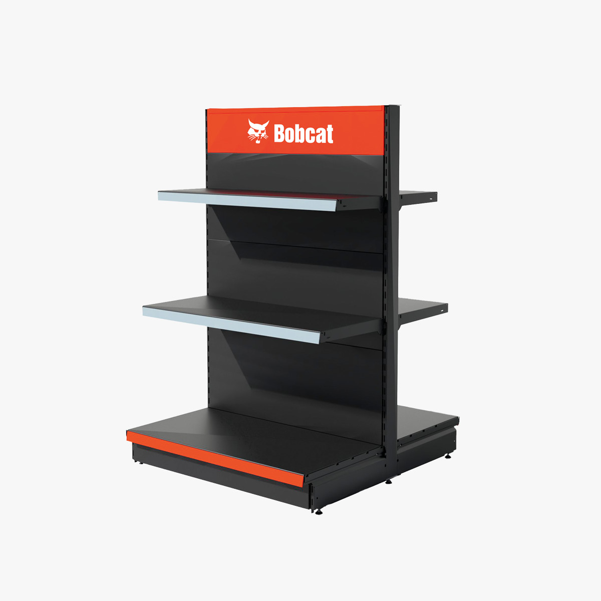 A medium sized gondola is a great way of presenting additional Bobcat items to showroom visitors. With options including single- and double-sided designs and solid and perforated back walls.
