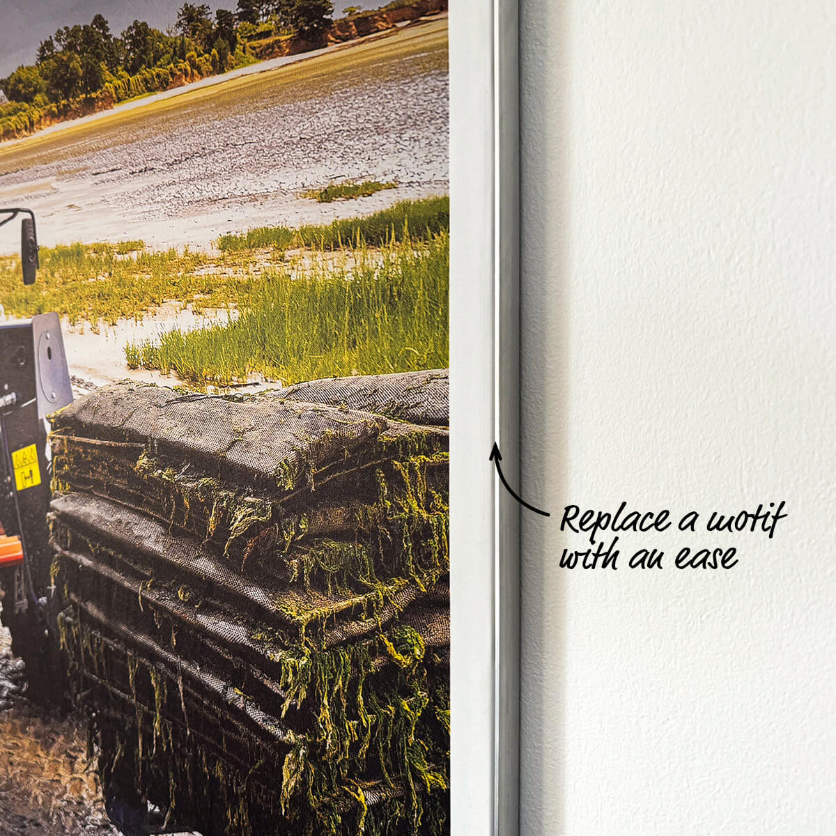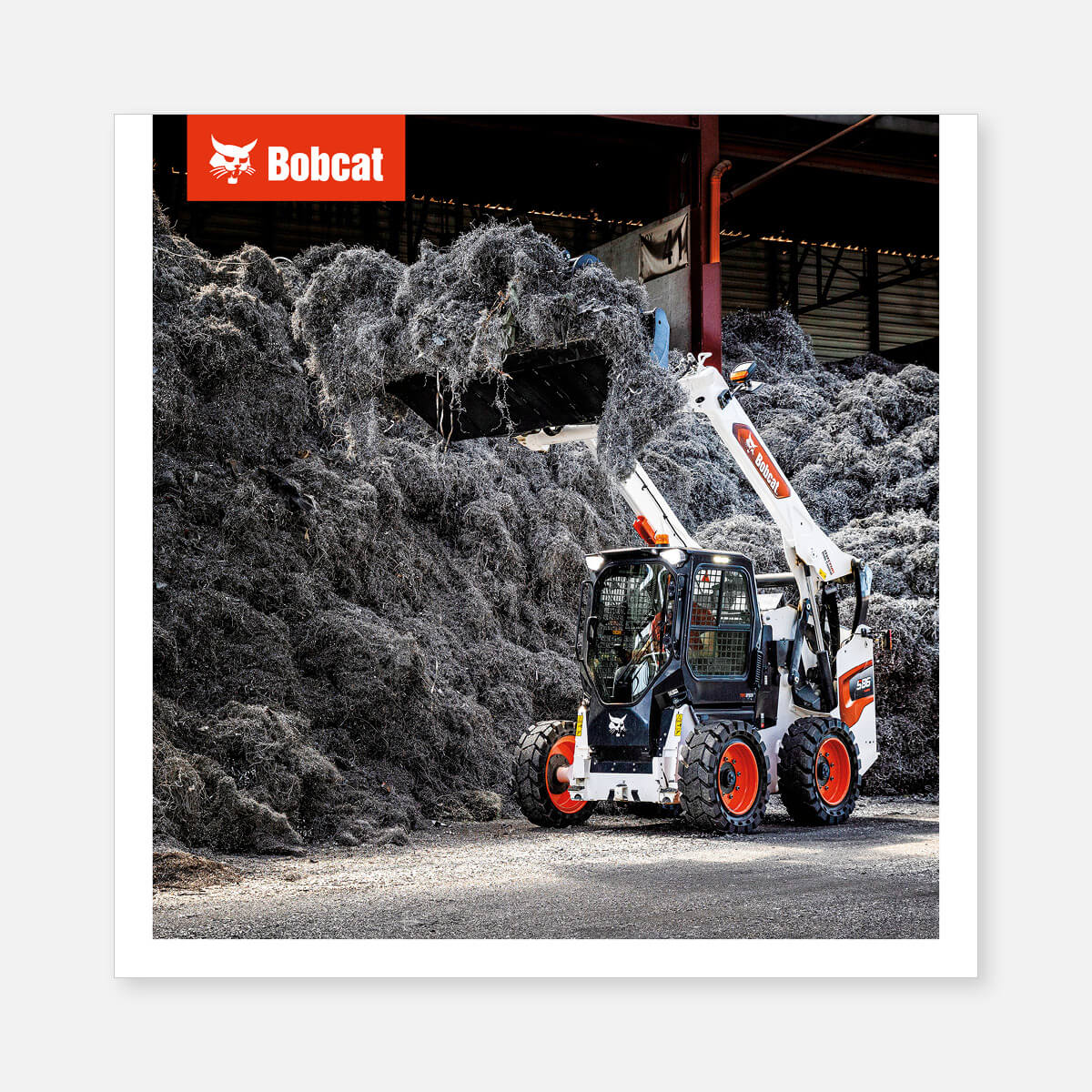 Product poster with a motif of S86 skid steer loader with metal waste, printed on a high quality fabric mounted on an aluminium frame.