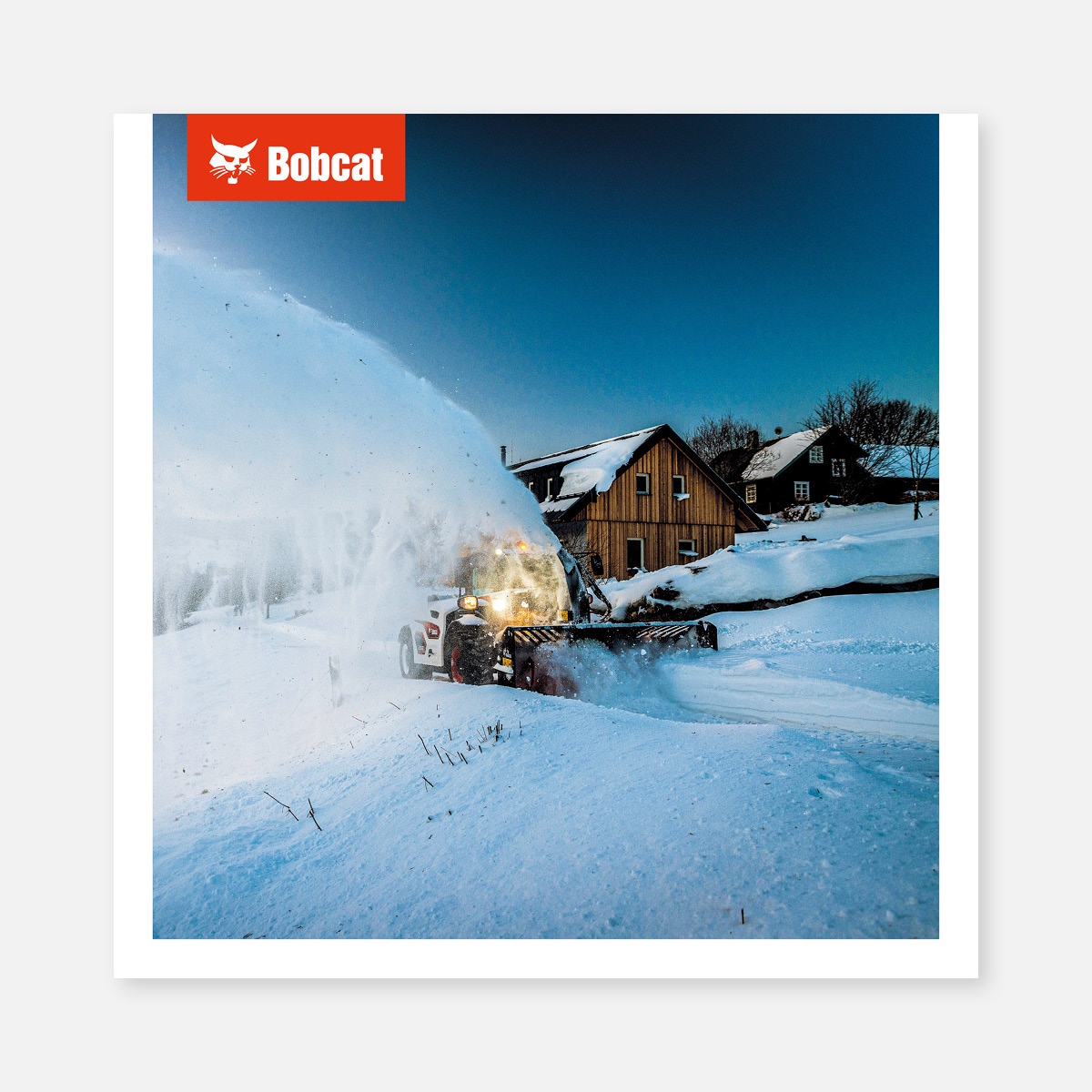 Product poster with a motif of A telescopic loader clearing the road off snow, printed directly on 5 mm PVC panel, is an easy and affordable way to promote Bobcat products to your clients and colleagues.