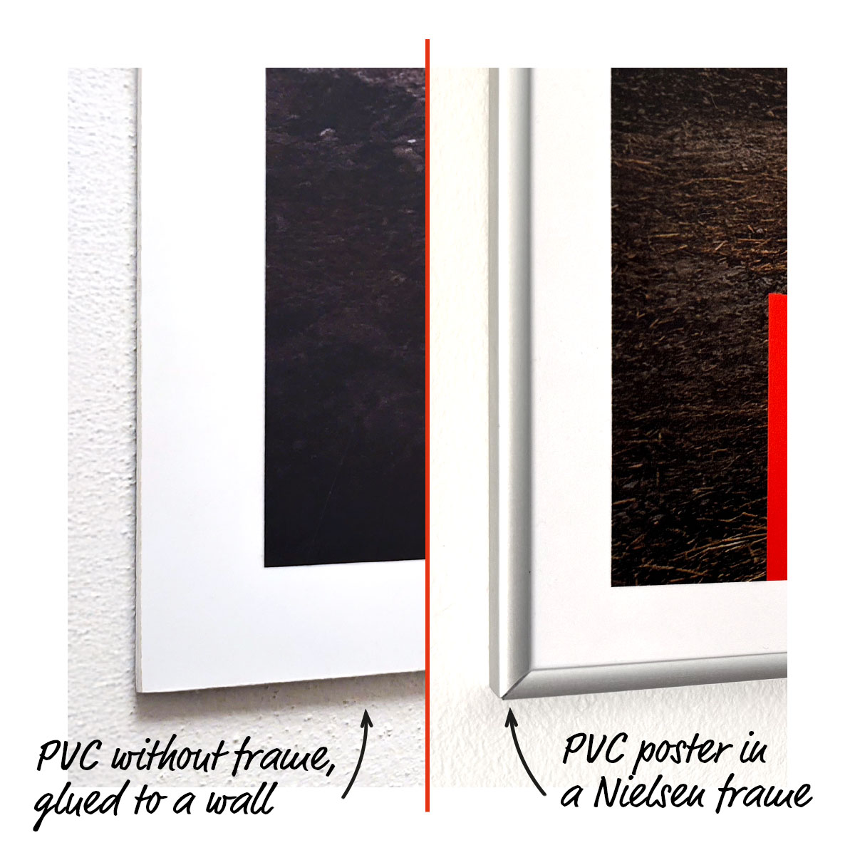 The poster can be produced in various sizes – A2 (594 × 420 mm), A1 (840 × 594 mm), and 1×1 m (only if Nielsen frame is used) – and accompanied by a Nielsen frame for easy installation.