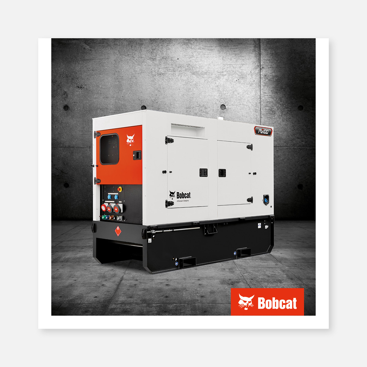 Product poster with a motif of PG100 diesel-powered towable generator, printed directly on 5 mm PVC panel, is an easy and affordable way to promote Bobcat products to your clients and colleagues.